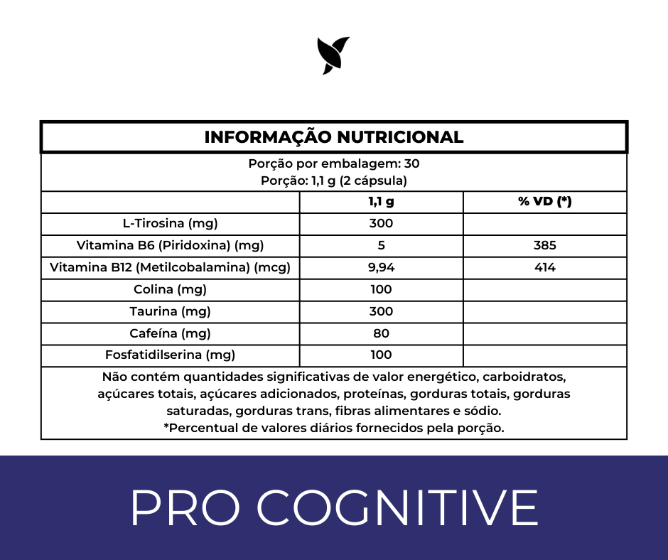 Ingredientes: Taurina, L-tirosina, fosfatidilserina de lecitina de soja, cafeína, bitartarato de colina, cloridrato de piridoxina (vit. B6), metilcobalamina e antiumectante dióxido de silicio. Ingredientes da cápsula: Gelatina. ALÉRGICOS: CONTÉM DERIVADOS DE SOJA. NÃO CONTÉM GLÚTEN. ALÉRGICOS: CONTÉM DERIVADOS DE SOJA.NÃO CONTÉM GLÚTEN.