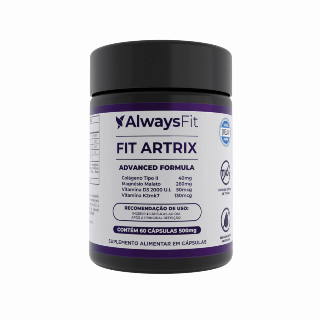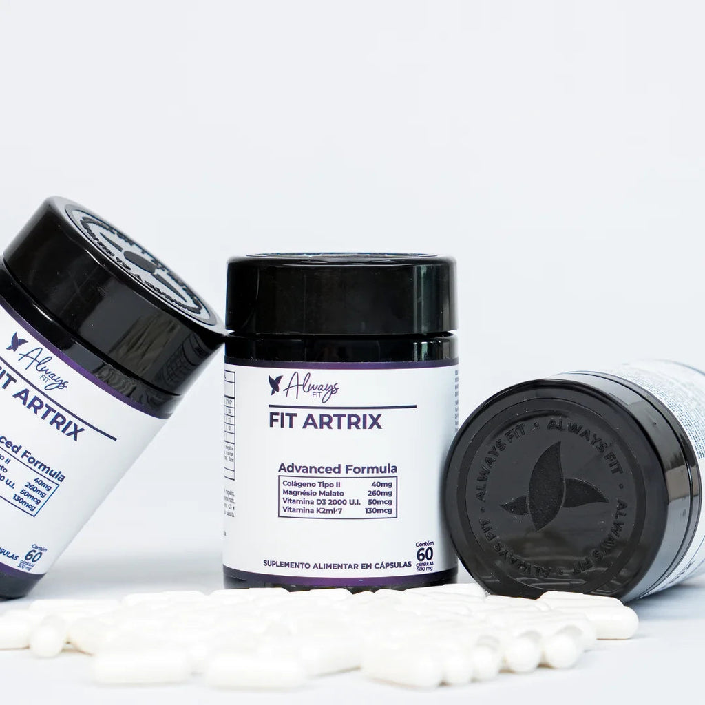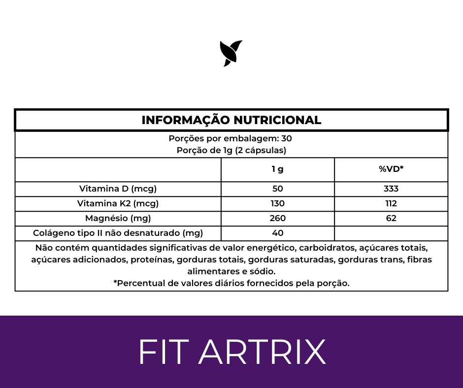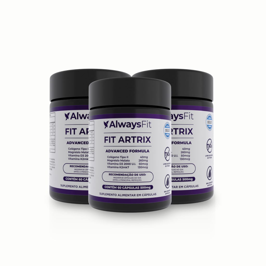 FitArtrix – Suplemento com Colágeno Tipo II, Magnésio, Vitamina D3 e K2 FitArtrix é um suplemento alimentar em cápsulas formulado com nutrientes selecionados para complementar sua rotina com compostos que participam de processos relacionados à saúde óssea e articular. Sua fórmula combina colágeno tipo II não desnaturado, magnésio dimalato, vitamina D3 e vitamina K2 MK7, em uma apresentação prática para uso diário.