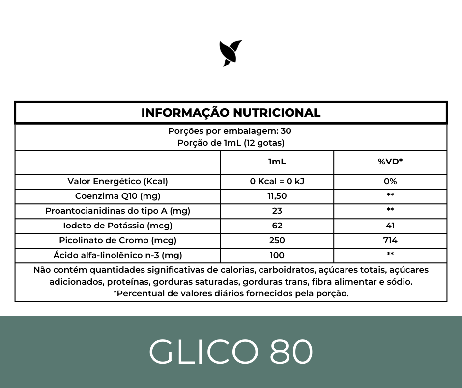 Glico80® é um suplemento alimentar desenvolvido para adultos a partir de 19 anos, com fórmula líquida sublingual que combina Coenzima Q10, Cromo (picolinato), extrato de Canela (Cinnamomum burmanii) e Óleo de Abacate. Uma solução prática e de rápida absorção para complementar a rotina alimentar com nutrientes selecionados.