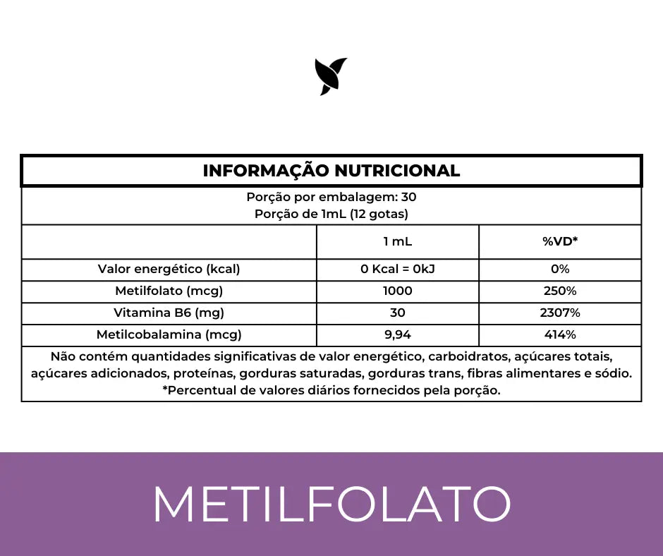 INGREDIENTES: Água purificada, cloridrato de piridoxina (vitamina B6), L-metilfolato de cálcio (vitamina B9), metilcobalamina (vitamina B12), glicerina, acidulante ácido cítrico, conservante sorbato de potássio e edulcorante sucralose.NÃO CONTÉM GLÚTEN. ⚠️ Advertências: ⚠️ Suplemento alimentar — não tem finalidade medicamentosa.⚠️ Este produto não é um medicamento.⚠️ Não exceder a recomendação diária indicada na embalagem.⚠️ Gestantes, nutrizes e crianças devem usar apenas sob orientação de profissional de saúde.⚠️ Pessoas com doenças ou em uso de medicamentos devem consultar um médico antes do uso.