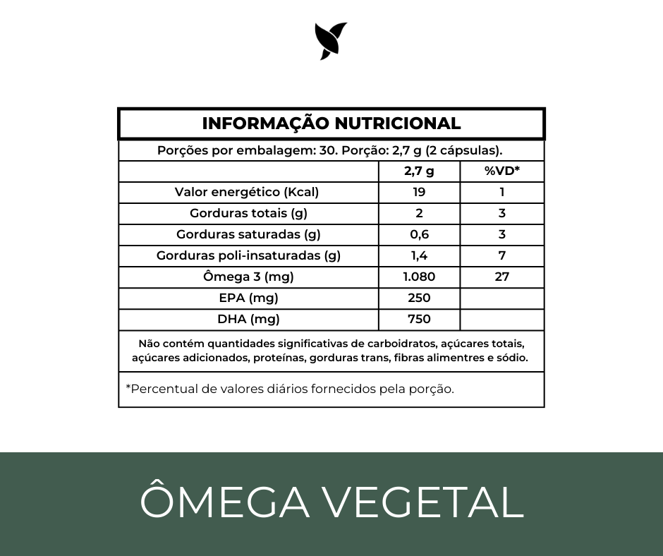 Benefícios nutricionais do Ômega 3 Vegetal: Função Cerebral e Visão: O DHA contribui para o bom funcionamento do cérebro e da visão. Saúde Cardiovascular: O EPA e o DHA auxiliam na regulação de triglicerídeos e pressão arterial. Fonte Sustentável: Ideal para quem busca uma alternativa vegetal e consciente ao óleo de peixe. Sem retrogosto de peixe: Cápsulas com odor e sabor neutros, fáceis de consumir.
