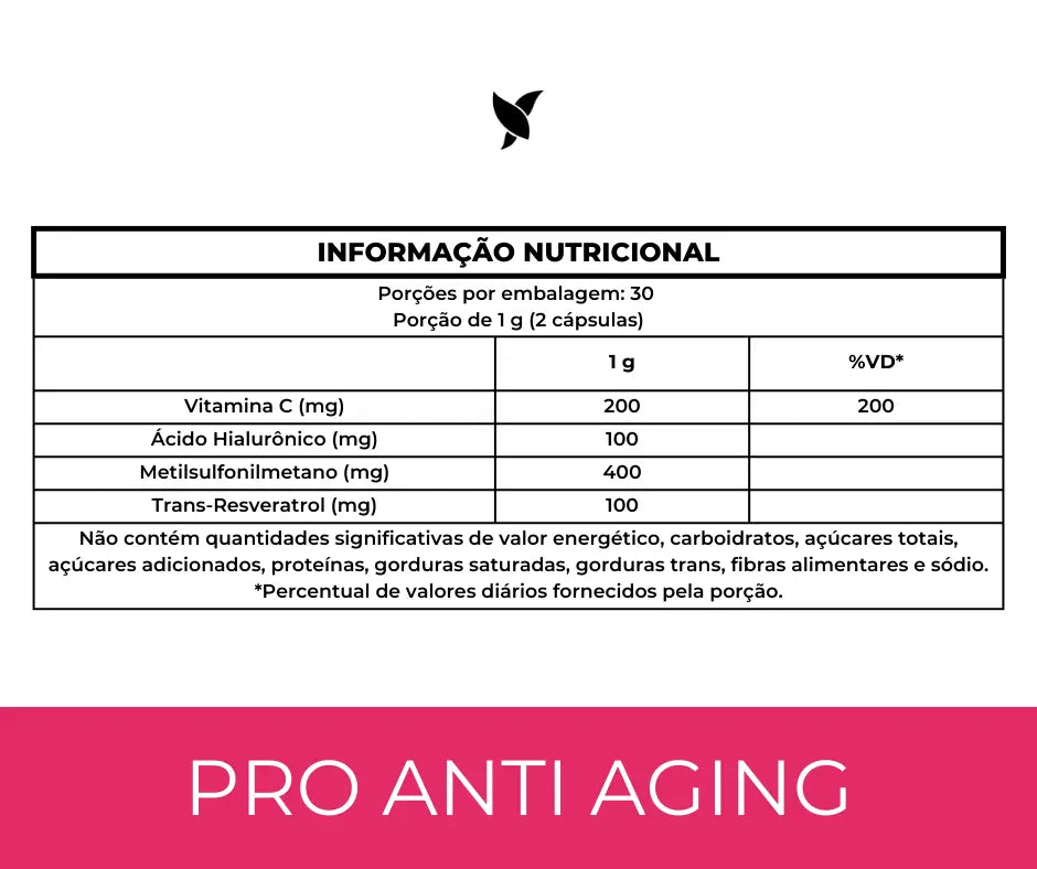 Pro Anti-Aging é um suplemento alimentar em cápsulas que combina Ácido Hialurônico, Trans-Resveratrol, Vitamina C e MSM (Metilsulfonilmetano) — nutrientes com alegações aprovadas pela Anvisa, que contribuem para a saúde da pele, proteção antioxidante e manutenção de articulações saudáveis.