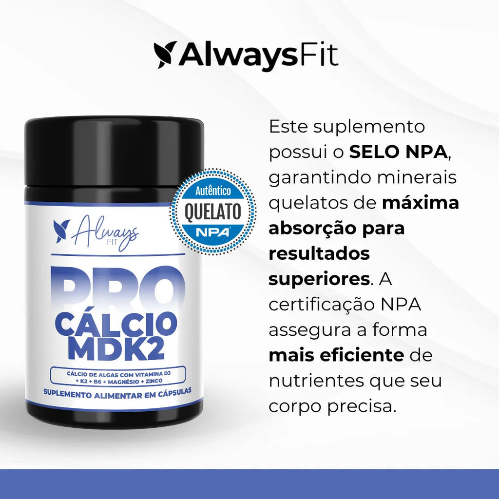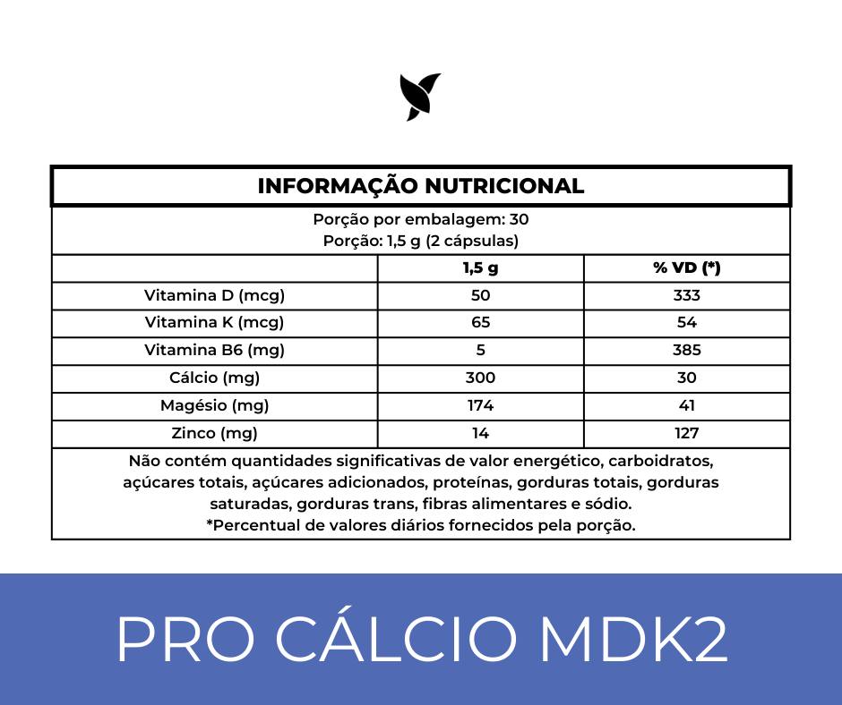 O Pro Cálcio MDK2 é um suplemento alimentar em cápsulas que combina cálcio de algas (Lithothamnion calcareum) com vitamina D3, vitamina K2 MK-7, magnésio, vitamina B6 e zinco. Sua fórmula foi desenvolvida para quem deseja manter ossos fortes, apoiar o metabolismo e complementar a alimentação com nutrientes essenciais ao bom funcionamento do organismo.